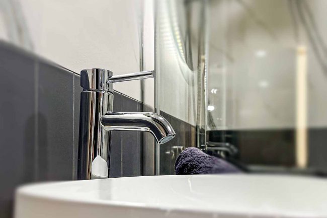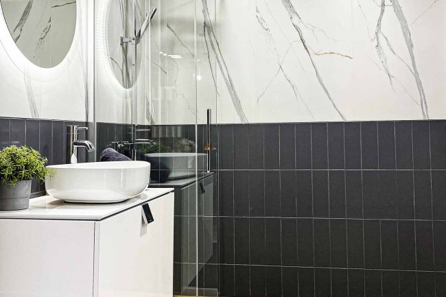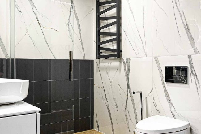 Łazienka ta została zaprojektowana w jasnej kolorystyce, z wykorzystaniem białej płytki, która jest pięknie kontrastowana przez elementy szarości. Takie połączenie kolorów sprawia, że pomieszczenie wydaje się przestronne i eleganckie. Dodatkowo, ciemna płytka i deska w tej łazience dodają ciepła i przytulności. W centralnym punkcie łazienki znajduje się wygodna umywalka nablatowa, którą uzupełnia praktyczna szafka wisząca. Dzięki niej, wszelkie potrzebne akcesoria do codziennej higieny są zawsze pod ręką, a jednocześnie z łatwością można utrzymać porządek w łazience.