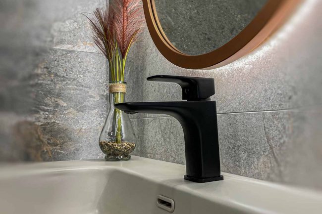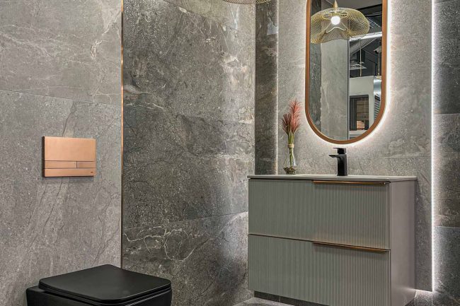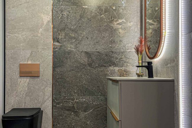 W tej łazience dominuje piękna płytka ceramiczna w stylu kamienia, która nadaje wnętrzu naturalny i organiczny wygląd. Jej tekstura i odcienie przypominają autentyczny kamień, tworząc atmosferę spokoju i relaksu. Płytka ta jest doskonale dopasowana do otoczenia, harmonizując ze wszystkimi innymi elementami wystroju.
