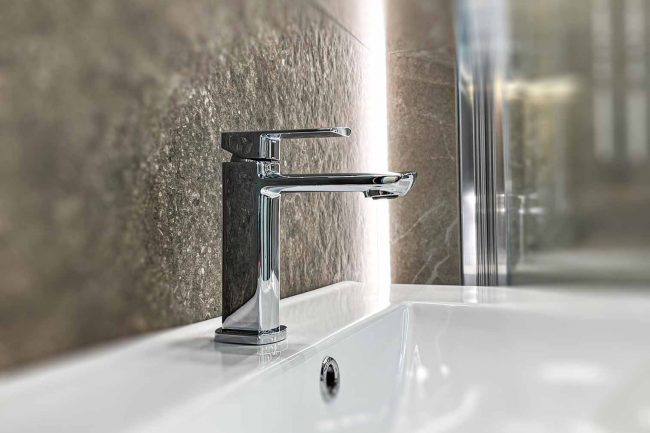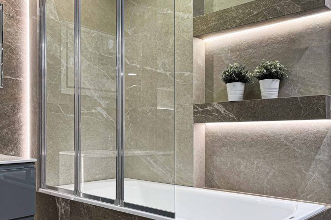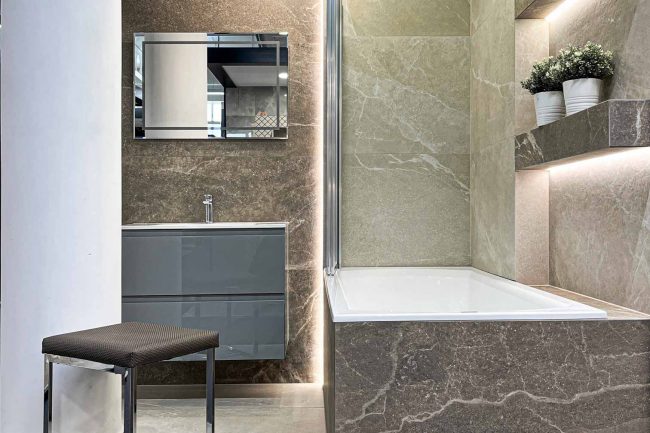 Łazienka utrzymana w stonowanych i spokojnych kolorach, idealna dla osób ceniących sobie prostotę i funkcjonalność. Głównym elementem jest naturalny kamień o ciepłych odcieniach beżu, który dodaje pomieszczeniu przytulności i naturalnego charakteru. Wisząca szafka o szarym odcieniu dopełnia kompozycję, nadając pomieszczeniu minimalistycznego stylu. W łazience znajdują się również elementy pozwalające na wygodne korzystanie z pomieszczenia, co sprawia, że jest ono funkcjonalne i komfortowe.