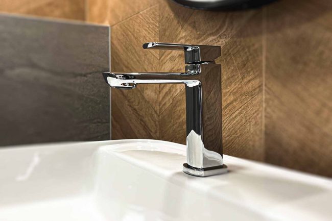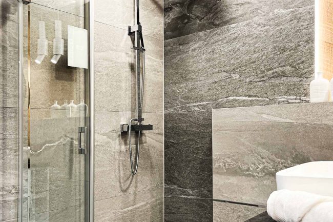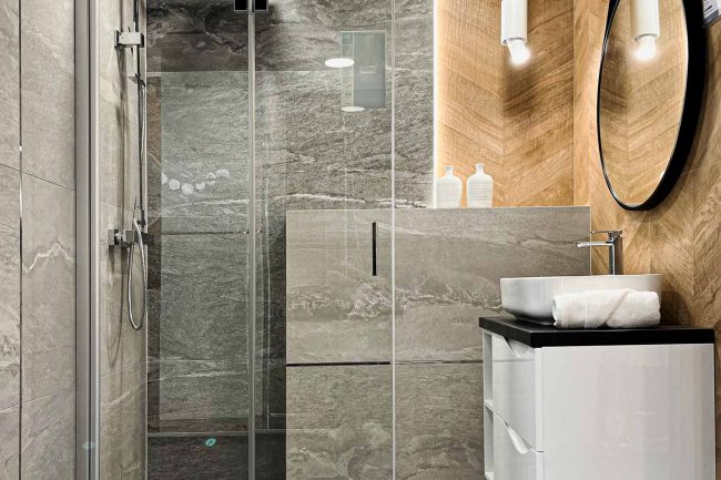 Ta łazienka zachwyca swoim surowym i naturalnym klimatem, którym emanuje dzięki zastosowaniu płytki ceramicznej z wzorem deski, przypominającej wyglądem naturalne drewno. Betonowa szarość tworzy idealne tło dla takiej kompozycji, dodając pomieszczeniu industrialnego charakteru. Szafka wisząca z czarnym blatem i nablatowa umywalka dopełniają całości, tworząc harmonijną i spójną aranżację. Kolorystyka pomieszczenia doskonale wpisuje się w obramowanie lustra, tworząc wrażenie pełnej harmonii i równowagi. Ta łazienka to idealne miejsce dla osób ceniących minimalistyczny i naturalny styl.