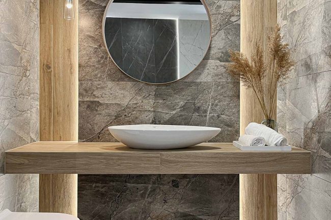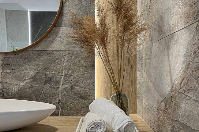 Ta łazienka emanuje spokojem i harmonią dzięki swojemu naturalnemu wyglądowi. Wszystko zaczyna się od nietuzinkowego kamienia, który zdominował wnętrze. Jego odcienie beżu i szarości idealnie współgrają z minimalistycznym designem. Całość jest dopełniona wyjątkową grą świateł, która sprawia, że łazienka nabiera głębi. Centralnie położona umywalka zapewnia wygodę użytkowania, a jej naturalny wygląd idealnie współgra z otaczającymi ją kolorami. Ale to okrągłe lustro, które przyciąga uwagę, dodaje temu miejscu swojego uroku. Ta łazienka to idealne miejsce dla miłośników naturalnych kolorów i prostoty, którzy szukają spokoju i relaksu w codziennej kąpieli.