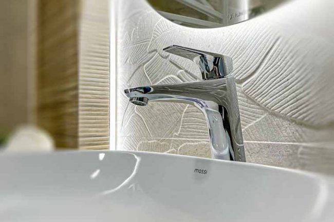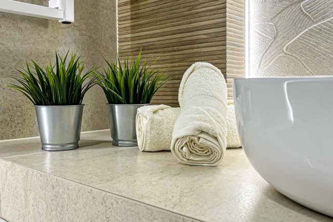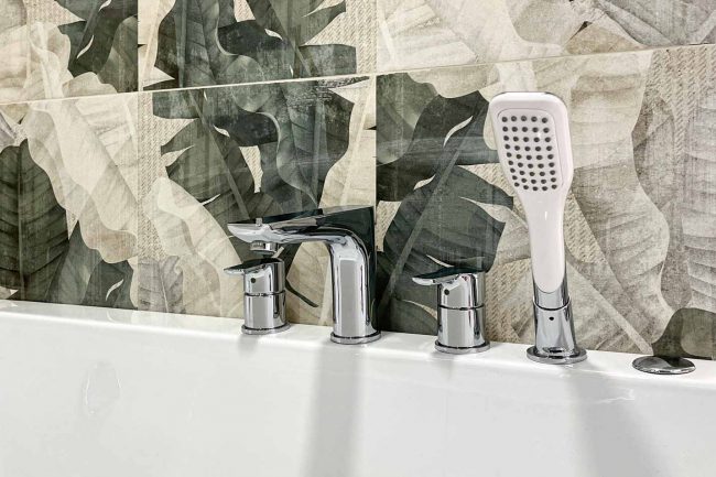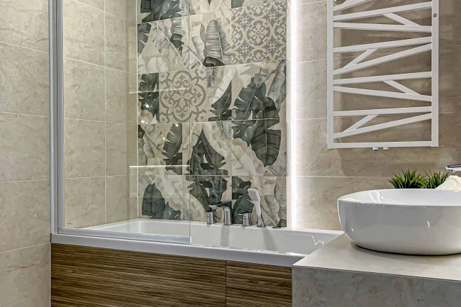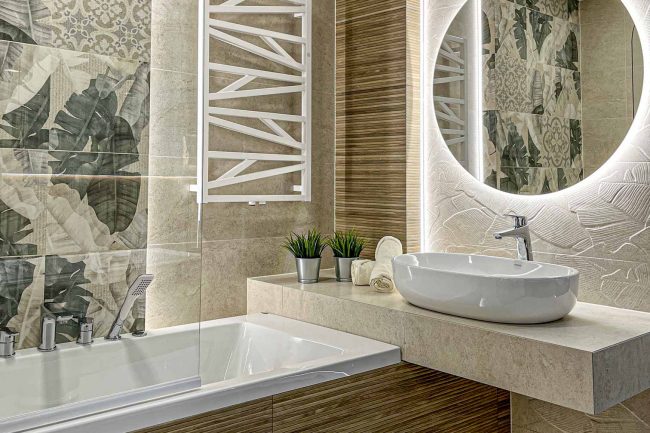 Ta łazienka urzeka prostotą i jednocześnie ciekawymi detalami. Biało-beżowa kolorystyka zdominowała aranżację, ale dodatkowo została wzbogacona o oryginalne wzory dekoracyjne, które nadają wnętrzu charakteru. Podstawa pod umywalkę i wannę w zabudowie, wykonana w nietypowym kształcie, dodaje uroku i tworzy spójność z całością. Umywalka nablatowa wprowadza nowoczesny akcent, a okrągłe lustro z podświetleniem dopełnia całość, zapewniając przyjemne i funkcjonalne oświetlenie. To miejsce, gdzie można zrelaksować się i odprężyć po ciężkim dniu.