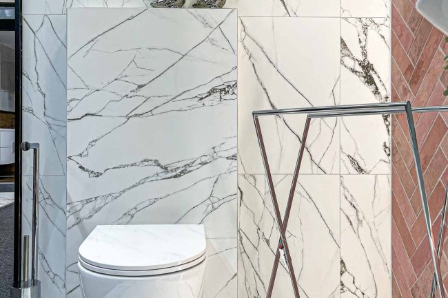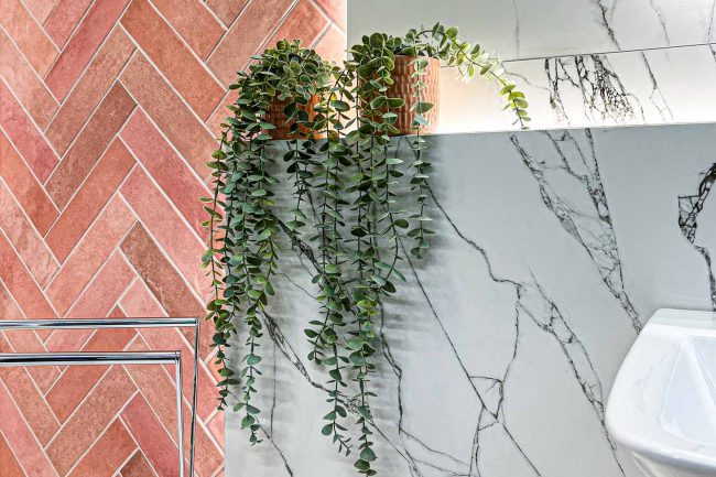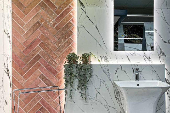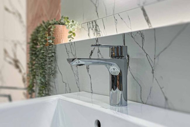 Łazienka ta z pewnością przyciąga uwagę swoim nietuzinkowym stylem. Klasyczne białe płytki z żyłkami szarości stanowią bazę aranżacji. Umywalka podwieszana dodaje lekkości i czystości, a wyjątkowe oświetlenie nad nią tworzy ciekawą grę świateł. Jednak to mozaika w odcieniach różu z pewnością przyciąga uwagę i nadaje całości wyjątkowości oraz ciepła.