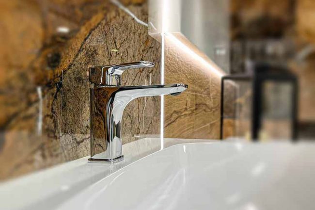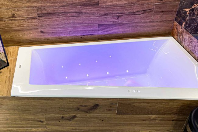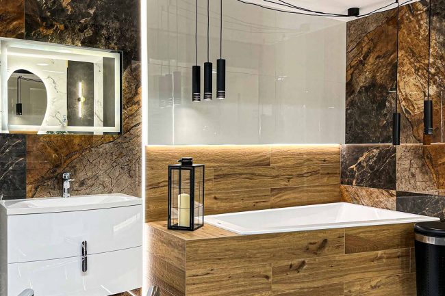 Ta łazienka emanuje wyjątkowym, nietuzinkowym klimatem. Duża wanna w zabudowie przyciąga uwagę, a deska dodaje do niej naturalnego uroku. Nietuzinkowe oświetlenie dodaje elegancji, podczas gdy szafka wisząca i płytki w odcieniach miedzi dopełniają całości. To wnętrze, w którym można poczuć się wyjątkowo i zrelaksować.