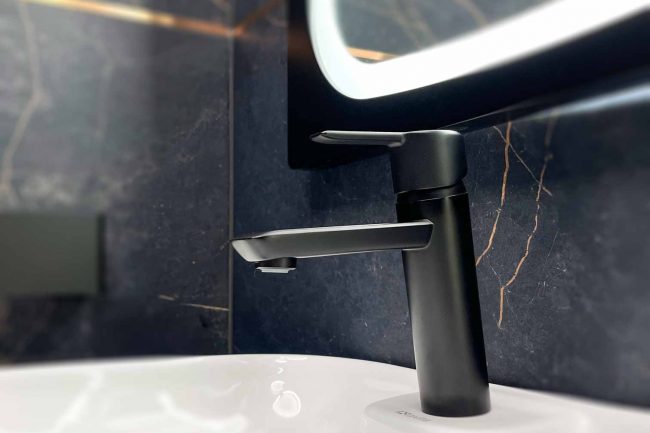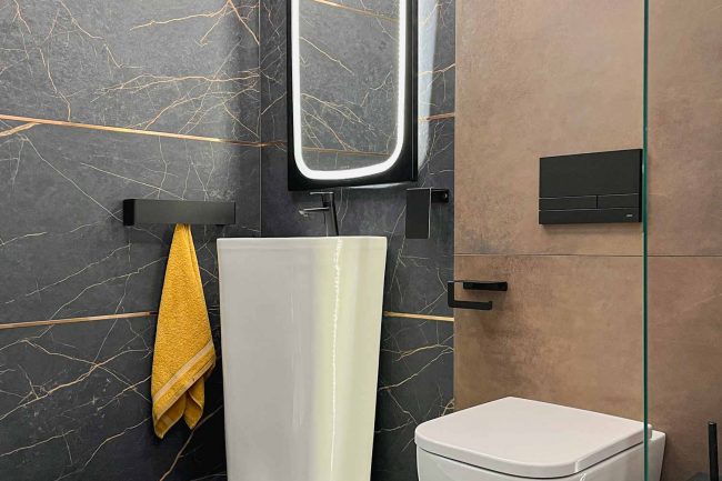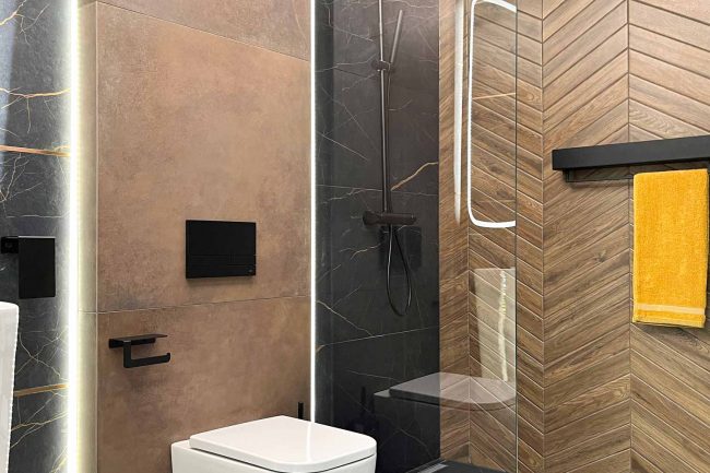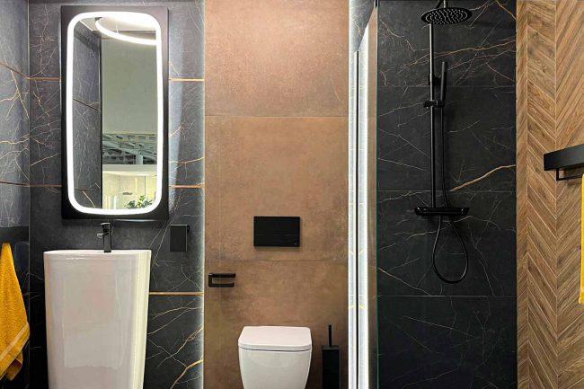 Ta nowoczesna łazienka zaskakuje swoim nietuzinkowym stylem. Czerń jest tu dominującym kolorem, który w połączeniu z rdzawą żyłką i delikatnym odcieniem miedzi tworzy wyjątkową atmosferę. Nietuzinkowy wzór deseczki w jodełkę na ścianach dodał tej łazience niepowtarzalnego stylu. Czarne dodatki doskonale komponują się z całością, a oświetlenie wspaniale podkreśla piękno aranżacji, nie można zapomnieć o harmonijnej i dostojnej umywalce wolnostojącej, która dodaje elegancji tej nowoczesnej łazience. Jej wyjątkowy design przykuwa uwagę i idealnie wpisuje się w całą aranżację.