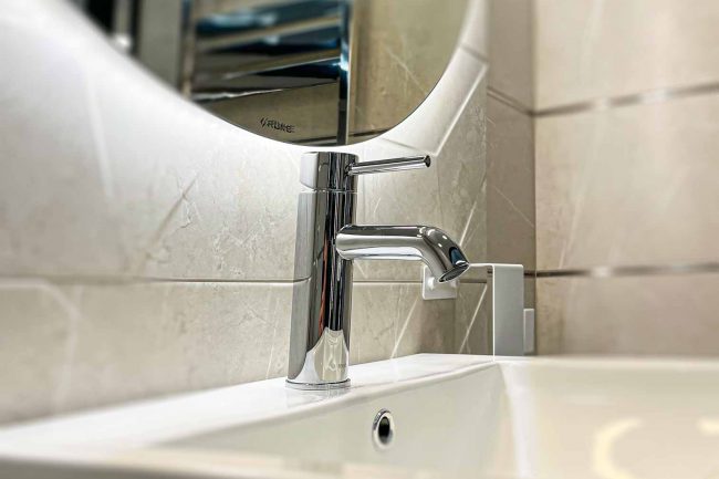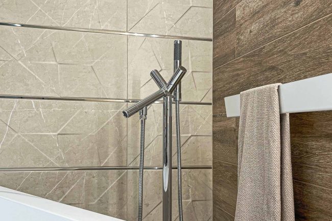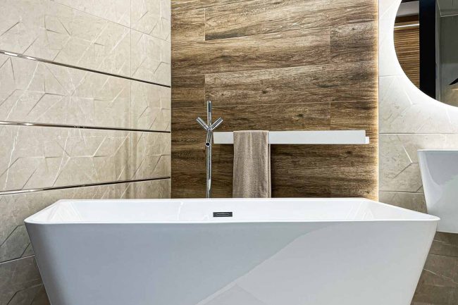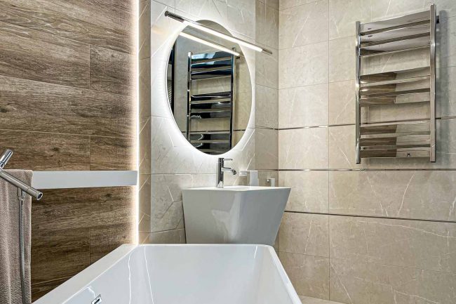 W tej łazience dominują ciepłe odcienie beżu, które nadają jej przytulnego charakteru. Wanna wolnostojąca zachęca do relaksu i odpoczynku, a lustro umieszczone na ścianie dodaje niepowtarzalnego charakteru aranżacji. Oświetlenie odgrywa kluczową rolę, podkreślając piękno kompozycji.