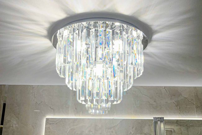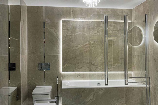 Ciekawa kamienna propozycja z oryginalnym oświetleniem i pięknym lustrem.