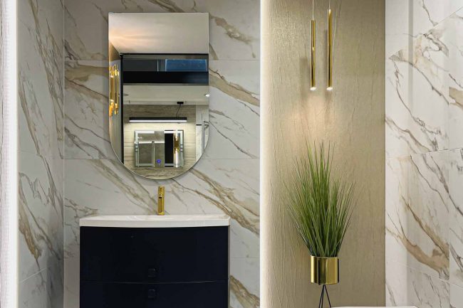 Łazienka glamour to pomieszczenie, które zachwyca eleganckim i stylowym wykończeniem. Centralnym punktem aranżacji jest duże lustro, które wprowadza do łazienki przestrzeń i odbija światło, dodając pomieszczeniu blasku i elegancji. Piękna szafka w kolorze niebieskim, doskonale wpasowuje się w całą aranżację. Dzięki temu pomieszczenie nabiera charakteru. Złota tapeta oraz płytki Calacatta to elementy, które dodają łazience blasku. Złote dodatki, jak lampy i armatura, idealnie komponują się z płytkami, wprowadzając do łazienki elegancki styl.