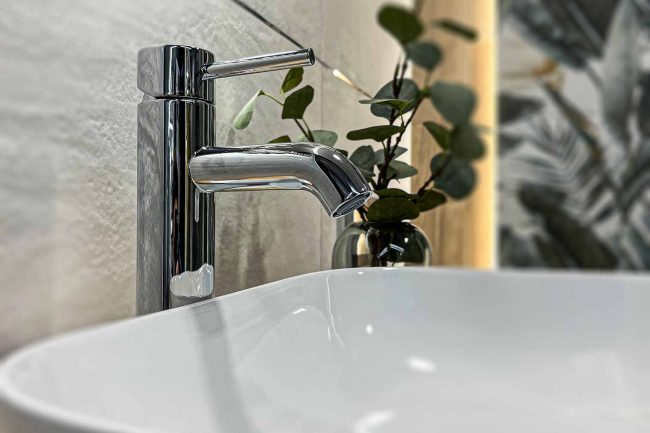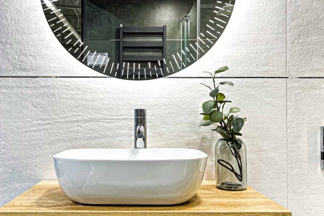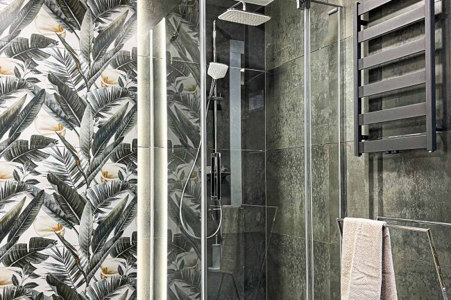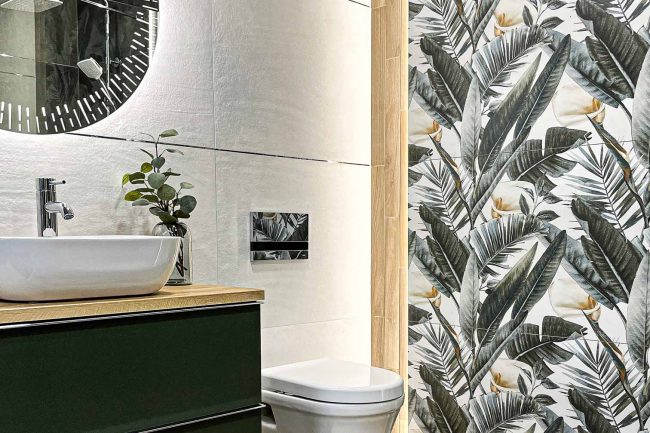 Ta łazienka ma białe płytki z delikatnym wzorem, co nadaje pomieszczeniu subtelności i elegancji. Dodatkowo zastosowana została płytka dekoracyjna z liśćmi, co wprowadza do wnętrza nutkę natury. Szafka z drewnianym blatem oraz umywalka nablatowa są idealnie dopasowane do całości i dodają ciepła. Lustro z interesującym wzorem stanowi ciekawą ozdobę, która przyciąga uwagę i dodaje uroku. Łazienka ta emanuje przyjemną atmosferą, a zastosowane elementy łączą się w spójną całość. Jest to doskonałe miejsce dla osób ceniących sobie subtelne i przytulne wnętrza.