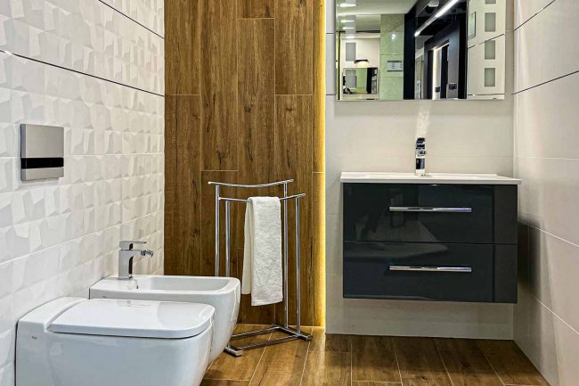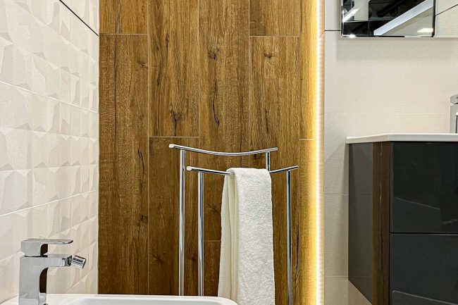 Łazienka utrzymana jest w jasnej i eleganckiej kolorystyce, co nadaje jej przyjemnego i harmonijnego wyglądu. Głównym elementem dekoracyjnym są białe płytki, które pokrywają ściany i podłogę. Ich minimalistyczny charakter doskonale współgra z nowoczesnym designem pomieszczenia. Na jednej ze ścian znajdują się również listwy przecinające białą powierzchnię, tworząc interesujący kontrast i dodając nieco dynamiki całej aranżacji, zastosowano ciepłą deskę na podłodze, która nadaje całości ciepły domowy akcent.