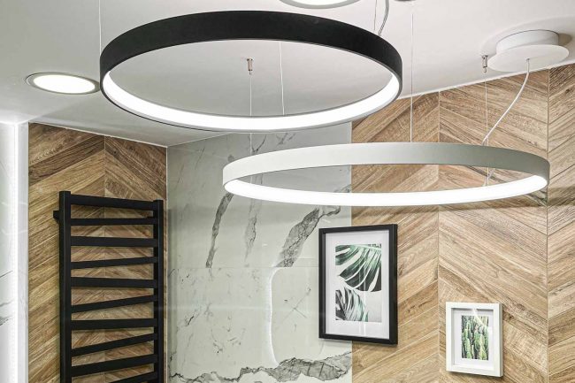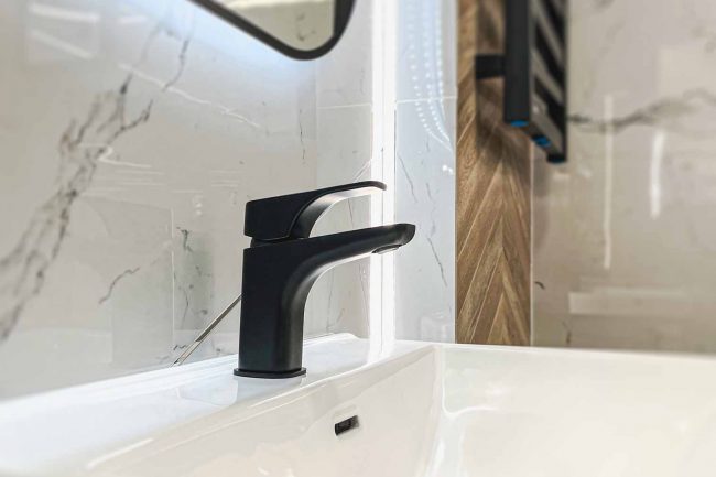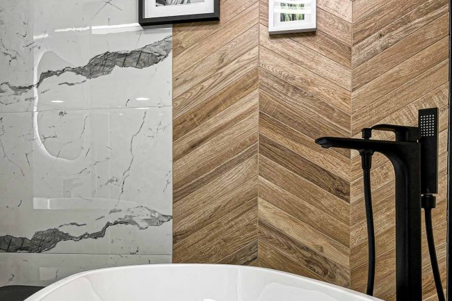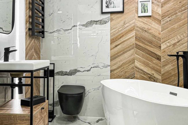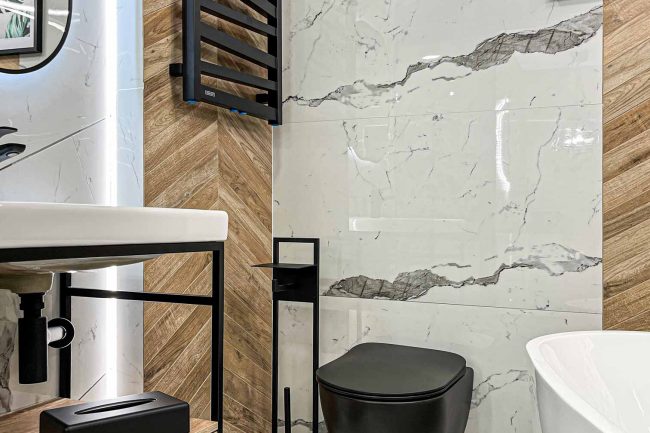 Ta łazienka emanuje nowoczesnym minimalizmem, zdominowanym przez wyjątkowe połączenie bieli, czerni i drewna. Ściany i podłoga są utrzymane w jasnej kolorystyce co nadaje wnętrzu poczucie przestronności i lekkości. Biel tworzy idealne tło dla innych elementów wystroju. Czarne akcenty w postaci armatury dodają charakteru i elegancji. Czarna armatura, kontrastuje z białym tłem, tworząc wyraziste, nowoczesne akcenty. Ich minimalistyczny design podkreśla prostotę i funkcjonalność całej łazienki. Jednak prawdziwą gwiazdą tej łazienki jest połyskująca biała wanna akrylowa. Jej kształt i wykończenie dodają wnętrzu wyjątkowej elegancji i luksusu. Wanna zaprasza do relaksu i wypoczynku po długim dniu, a jej biała powierzchnia odbija światło, dodając wnętrzu świeżości i czystości.