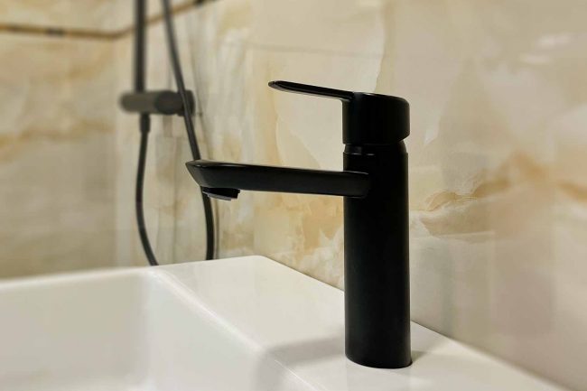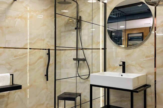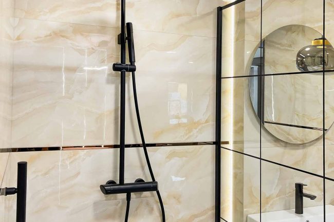 Łazienka wykonana z płytki imitującej beżowy marmur może prezentować się bardzo elegancko i luksusowo. Wszystko zależy od szczegółów aranżacji i wykorzystania dodatkowych elementów. W tym przypadku, ściany i podłoga wyłożone są piękną płytką o delikatnym beżowym odcieniu, który tworzy spójną całość wraz z wykończeniami w podobnej kolorystyce.