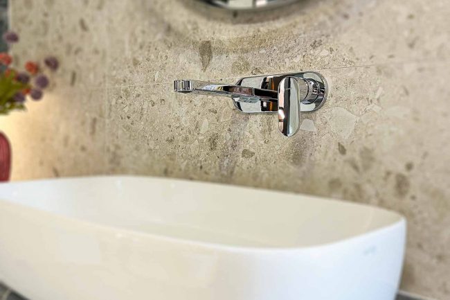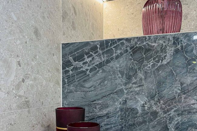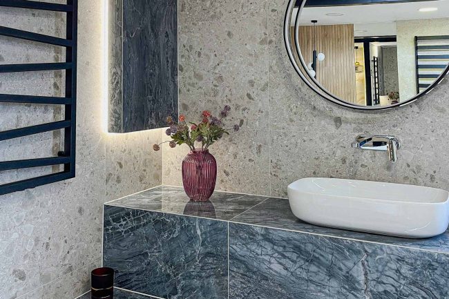 Łazienka wykonana z płytek przypominających andezyt i płytek przypominających niebieski marmur, w połączeniu z czarną armaturą i dodatkami, tworzy nowoczesne i eleganckie wnętrze. Andezytowe płytki w odcieniach szarości i czerni nadają łazience charakteru, a niebieski marmur dodaje pomieszczeniu oryginalnego akcentu.
