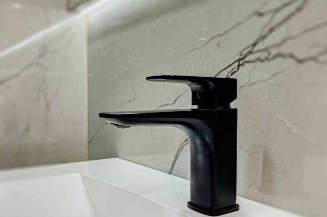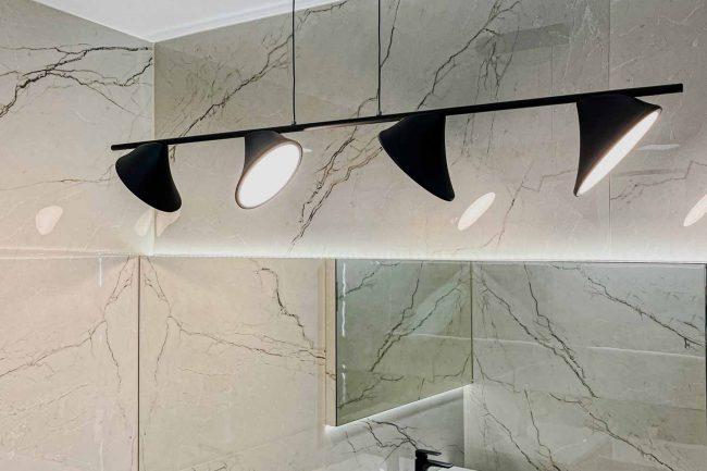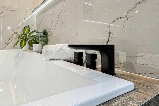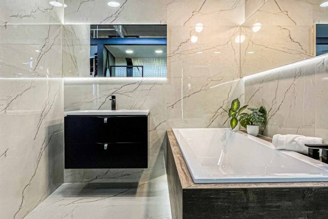Ta łazienka to prawdziwy przykład harmonijnie zaprojektowanego wnętrza. Głównym elementem w pomieszczeniu jest połyskująca płytka z szarą żyłką, która wraz z ciemnym dekorem wokół wanny tworzy elegancką i stylową atmosferę. Wanna w zabudowie, idealnie wpisuje się w klimat łazienki i zaprasza do zrelaksowania się po długim dniu. Całość dopełniają dodatki w kolorze czerni, które tworzą idealną kompozycję z resztą wystroju, dzięki dobremu zaprojektowaniu i dobrze dobranej kolorystyce, wydaje się przestronna i elegancka. To idealne miejsce dla osób ceniących sobie estetykę, styl i chcących odpocząć w przyjemnej atmosferze.