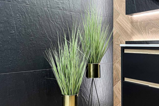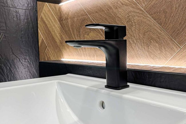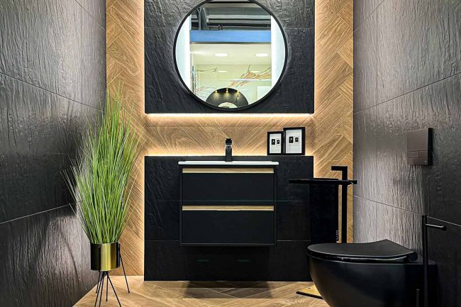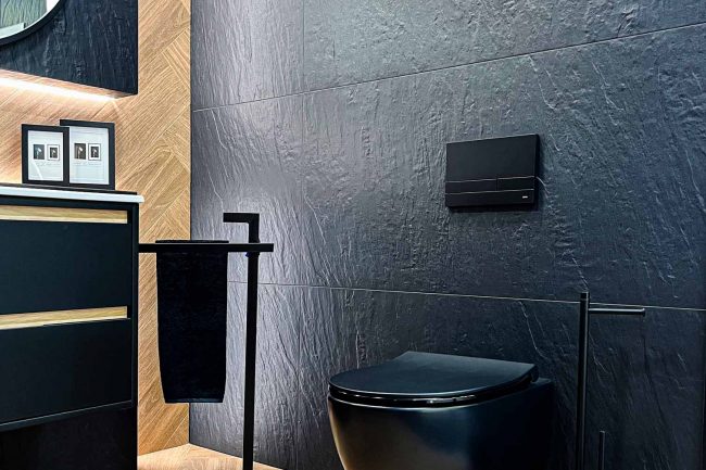 Ta łazienka to wyjątkowa propozycja dla osób, które cenią sobie elegancki styl i nowoczesne rozwiązania. Całe wnętrze utrzymane jest w kolorach czerni, co nadaje mu niepowtarzalnego charakteru i stylu. Drewniane elementy dodają wnętrzu ciepła i naturalności, a czarna armatura doskonale komponuje się z resztą wystroju, tworząc spójną i harmonijną całość. Lustro, umieszczone w centralnym punkcie, dodaje przestrzeni i optycznie powiększa pomieszczenie, a elegancka szafka wisząca zapewnia wystarczająco dużo miejsca na przechowywanie kosmetyków i akcesoriów łazienkowych. Całość tworzy wyjątkowe, nowoczesne i stylowe wnętrze, które z pewnością przypadnie do gustu miłośnikom minimalistycznego designu i eleganckiego stylu.