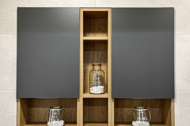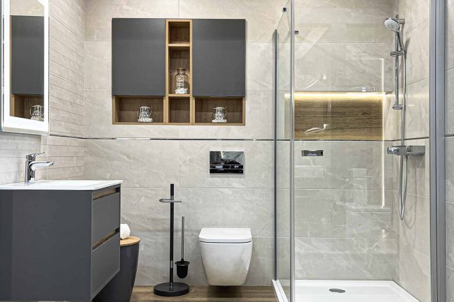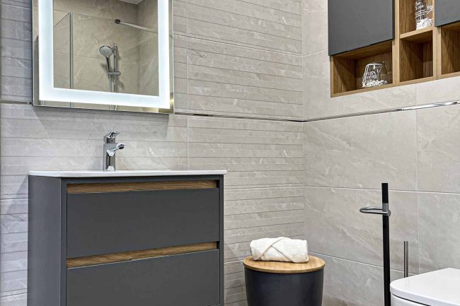 Ta łazienka to przykład doskonałego połączenia funkcjonalności i estetyki. Wnętrze zostało utrzymane w beżowych i szarych tonacjach, co dodaje mu elegancji i spokoju. Jednym z najciekawszych elementów wystroju jest wpuszczana szafka, która idealnie wpisuje się w kolorystykę pomieszczenia i stanowi doskonałe rozwiązanie w kwestii oszczędzania miejsca. Szafka umywalkowa, również utrzymana w harmonijnej kolorystyce, jest ergonomiczna i bardzo funkcjonalna, zapewniając odpowiednią ilość miejsca na przechowywanie kosmetyków i akcesoriów łazienkowych. Łazienka jest przestronna i wygodna w użytkowaniu, co pozwala na swobodne poruszanie się. Całość tworzy harmonijną, spójną i funkcjonalną przestrzeń, która z pewnością przypadnie do gustu osobom ceniącym sobie prostotę, elegancję i funkcjonalność.