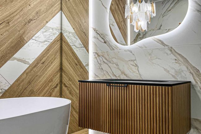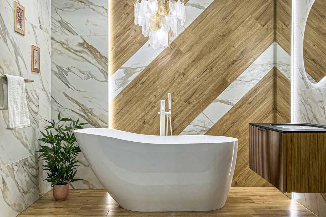 Ta łazienka to wyjątkowe połączenie bieli i drewna, które tworzy niezwykłą harmonię i estetykę. Cechą charakterystyczną tego wnętrza jest przepiękna wanna wolnostojąca, która jest prawdziwym centrum uwagi. Jej elegancki kształt i stylowy design dodają pomieszczeniu luksusowego charakteru. Szafka wisząca z wpuszczaną umywalką to nie tylko estetyczne rozwiązanie, ale także praktyczne i funkcjonalne. Pozwala ona na wygodne przechowywanie i organizację różnych akcesoriów łazienkowych, jednocześnie zachowując minimalistyczną i schludną estetykę.