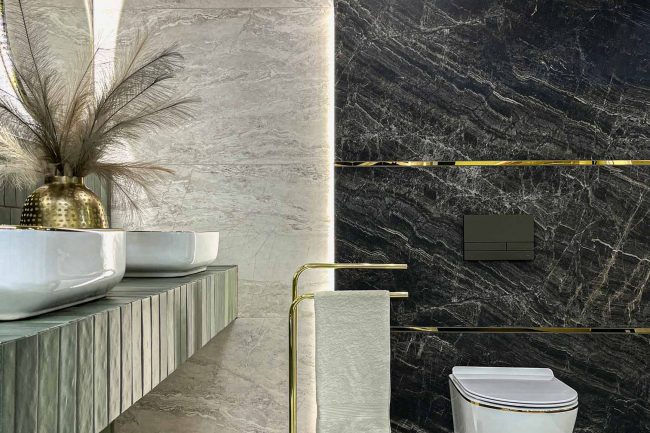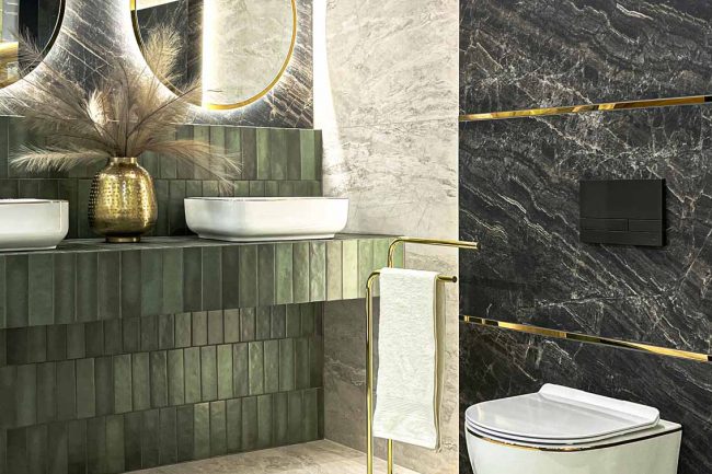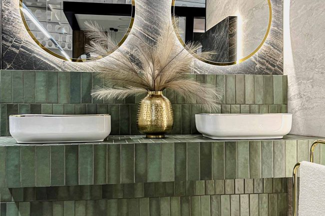 Ta łazienka jest niezwykle nietuzinkowa, a pierwszą rzeczą, która przyciąga uwagę jest zielona płyta ceramiczna. Jej różne odcienie tworzą wyjątkowy klimat i dodają pomieszczeniu charakteru. Lustra i umywalki są idealnie dopasowane do stylu aranżacji, tworząc spójną całość. Połączenie zielonej płytki dekoracyjnej i płytki z wzorem kamienia nadaje łazience elegancji, a jednocześnie stanowi idealne połączenie, które tonuje całą aranżację. Łazienka ta to idealne miejsce dla osób, które cenią sobie niepowtarzalny styl i wyjątkowy klimat wnętrza. Zielona płyta ceramiczna, połączona z innymi elementami wyposażenia, tworzy harmonijną i spójną całość. Dodatkowo, łazienka ta wydaje się przestronna i jasna, co dodaje pomieszczeniu jeszcze więcej charakteru i elegancji.