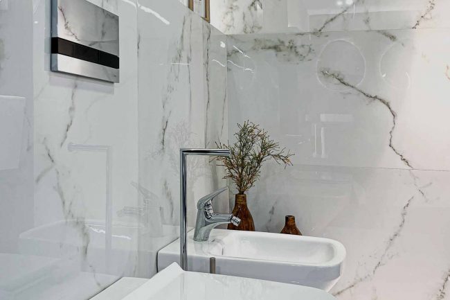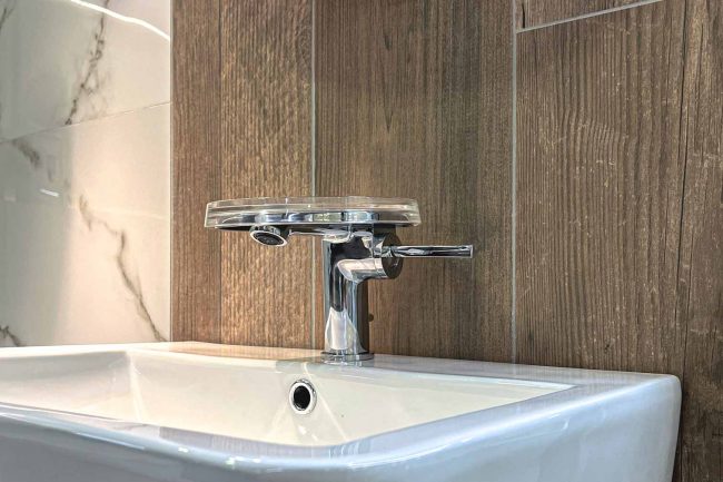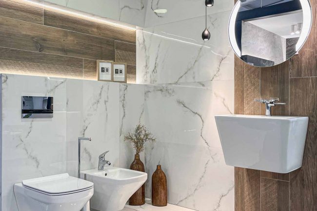 Ta łazienka wyróżnia się swoim niepowtarzalnym stylem, który łączy w sobie elementy naturalne z nowoczesnym designem. Piękne płytki z szarą żyłką i płytki z drewnianym wzorem stanowią doskonałe połączenie, które dodaje pomieszczeniu ciepła i przytulności. Biała ceramika w tym wnętrzu sprawia, że całość wydaje się jasna i przestronna. Wyróżniającą się umywalką wiszącą wzbogaca całą aranżację łazienki i stanowi doskonały akcent.