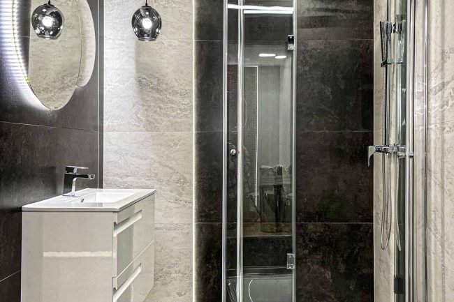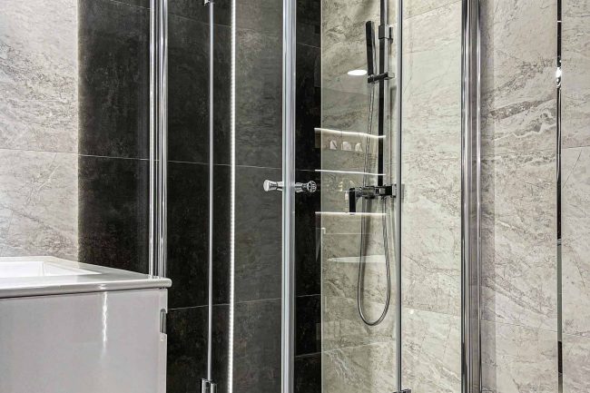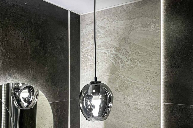 W tej łazience kamień w jasnym i szarym kolorze z ponadczasowymi wykończeniami w chromie tworzy eleganckie i stylowe wnętrze, a kabina prysznicowa i szafka umywalkowa dodają funkcjonalności i estetyki. Ta łazienka emanuje ponadczasowym pięknem i elegancją – wnętrze jest wypełnione delikatnymi odcieniami kamienia, które nadają mu naturalnego uroku i spokoju. Jasne i szare kolory kamienia tworzą harmonijną paletę barw, która jest ponadczasowa i łatwo dopasowuje się do różnych stylów wystroju. Wykończenia w chromie dodają wnętrzu nowoczesności i elegancji. Elementy takie jak baterie, uchwyty, czy akcesoria łazienkowe wykonane są w wysokim połysku chromu, co dodaje im wyrazistości i klasy. Chrom jest ponadczasowym materiałem, który harmonijnie komponuje się z kamieniem, tworząc elegancką i stylową całość.