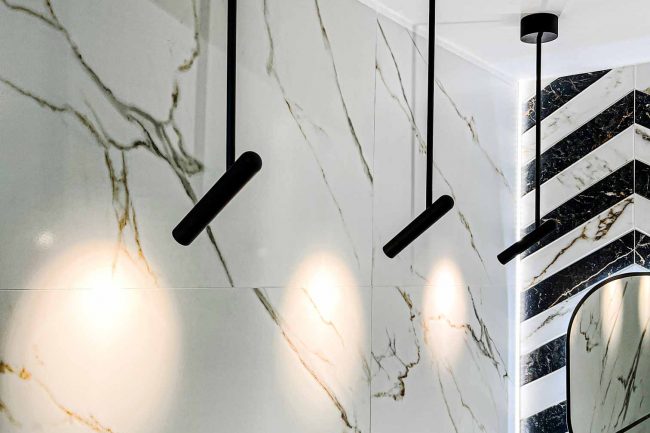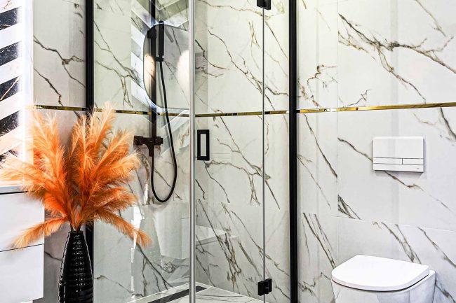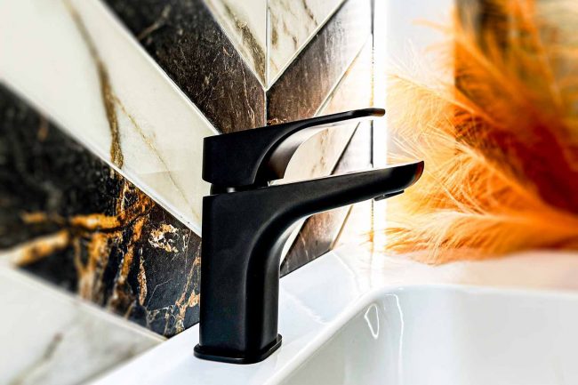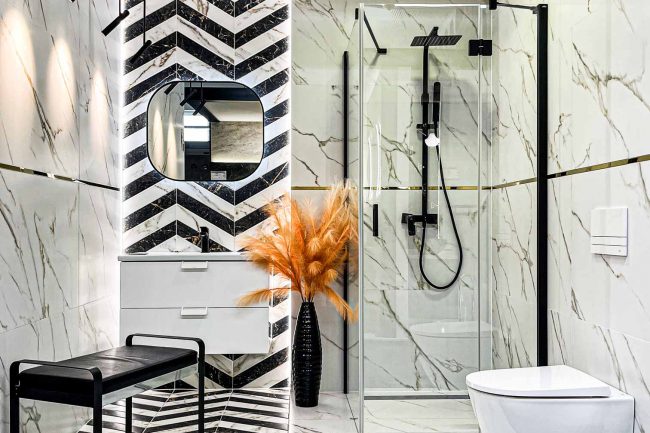 Ta łazienka to prawdziwy przykład klasycznej elegancji i stylu. Dominującymi kolorami są czerń i biel, które tworzą kontrastujące ze sobą elementy wystroju. Wyjątkowy wzór dekoracyjny w czarne paski nadaje pomieszczeniu wyjątkowego charakteru i nadaje mu subtelnej elegancji. Czarne dodatki, takie jak uchwyty czy wylewka wspaniale dopełniają całą kompozycję i tworzą harmonijny efekt. Pomimo swojej eleganckiej stylistyki, ta łazienka nie jest krzykliwa, a raczej zachwyca swoją subtelnością i prostotą. To niepowtarzalne wnętrze z pewnością zapada w pamięć i przyciąga uwagę swoim wyjątkowym stylem.